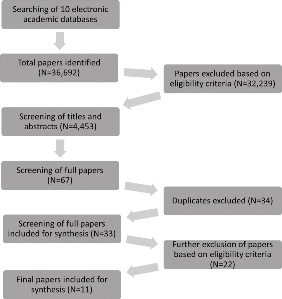 The total number of papers obtained from the initial search of the ten electronic databases was 36,692. After applying the eligibility criteria (Table 3), the researcher team screened 4,453 papers by briefly reviewing the titles and abstracts. The number of potentially relevant papers was reduced to 67. Following the elimination of duplicates (n=34), the remaining 33 papers were further analysed for relevance by reviewing the full text. This was done independently by the three researchers and agreement was reached for the final inclusion of 11 papers. This process is illustrated in Figure 1 and was adapted from Davis et al. (2009).